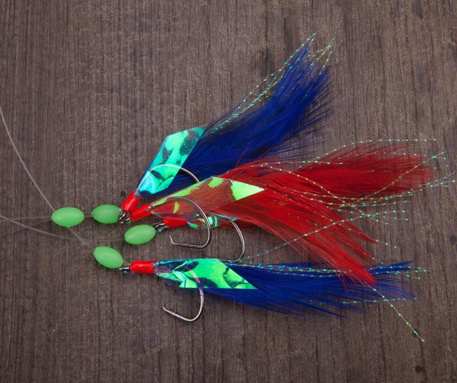 Dieses Makrelenvorfach ist mit vier Circle Hooks, Fluolockperlen und Fischhautimitation mit blauen und roten Federn ausgestattet.