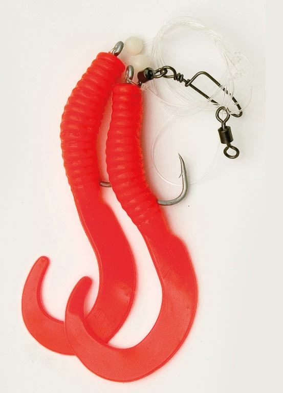 Großes und fängiges Doppeltwister-Vorfach mit zwei Twisterschwänzen an einem 8/0 Haken. Das Vorfach hat eine Länge von 110cm bei einem Durchmesser von 0,95mm)