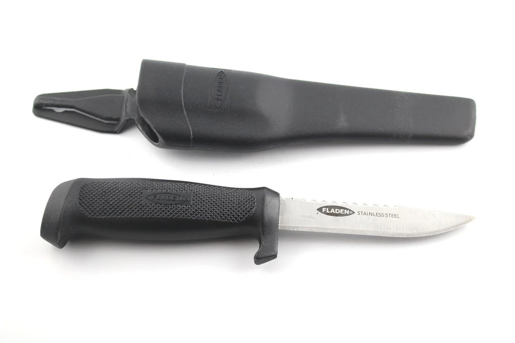 Dieses günstige Angelmesser gibt es in Schwarz oder Orange. Die Gesamtlänge beträgt 20,7cm und die Klinge ca. 10cm. Dieses Messer besitzt einen rutschfesten Gummigriff und eine Kunststoffscheide.