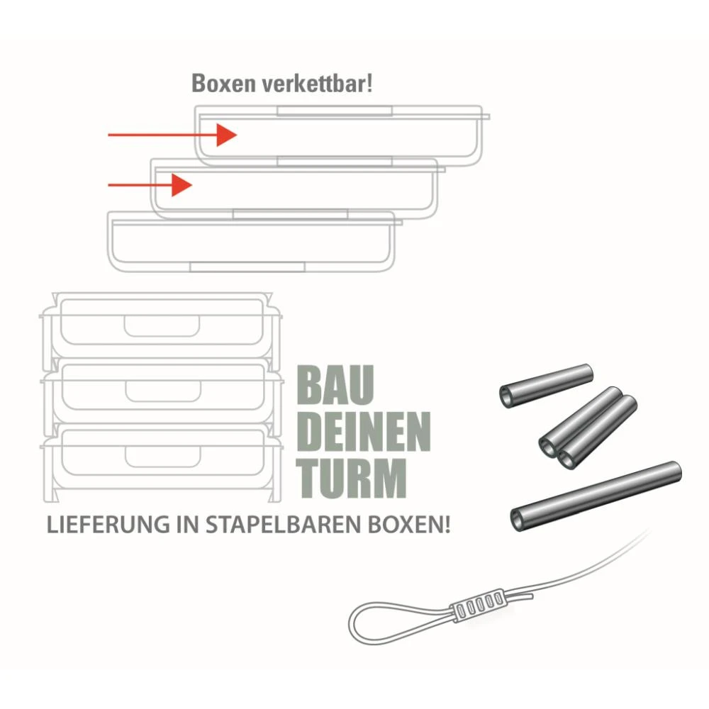 Diese Quetsch-Doppel-Hülsen sind ideal für Anfertigung von Vorfächern. Der Inhalt ist abhängig von der Größe und variiert von ca. 25-50 Stück.