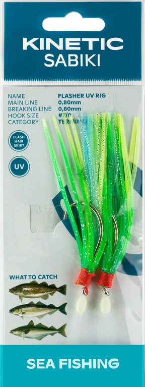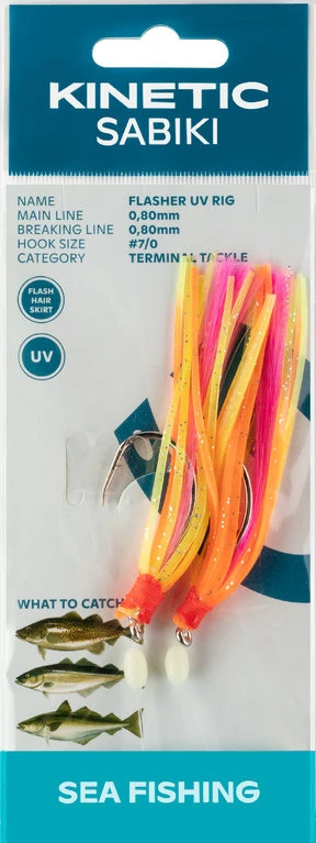 Dieses Vorfach besteht aus farbigen Gummifransen und Tinsel. Zwei starke Haken der Größe 7/0 und hochwertige monofile Schnur runden das Profil dieses Rigs ab. Es ist 130cm lang und an einer 0,80mm starken Schnur montiert.