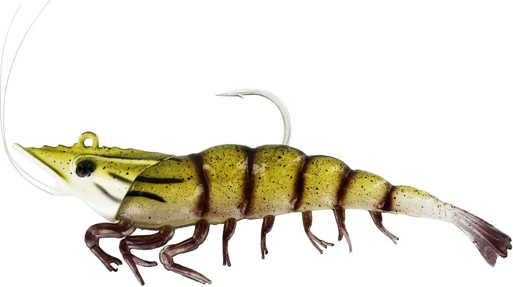 Bei dieser Version ist der Kopf vom Körper getrennt und besteht somit aus zwei verschiedenen Teilen, die man individuell zusammenstellen kann. Der Bleikopf ist ein naturgetreues Design einer Garnele und passt perfekt zum Körper, der durch einen innenliegenden Hakenkanal einfach zu montieren ist. Die zwei unterschiedlichen Körper unterscheiden sich durch die Schwanzformen – 1 Mal gibt es eine natürliche Garnelenform und 1 Mal einen Paddelschwanz für mehr Aktion. Es gibt zwei Größen von 8cm (18g) und 11cm (28g).